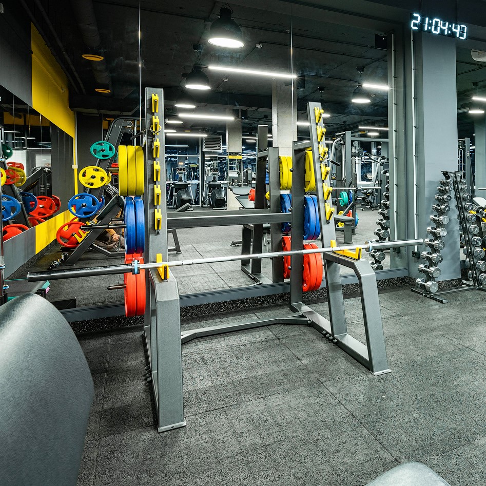 Два страховочных ограничителя представляют собой горизонтальные металлические балки, выполняющие функцию ограничителей амплитуды движения штанги при приседаниях и жиме стоя. Конструкция обеспечивает безопасную подстраховку спортсмена при срыве веса и защищает элементы рамы от ударных нагрузок. Поверхность ограничителей оснащена пластиковыми накладками, предотвращающими контакт металла с грифом.