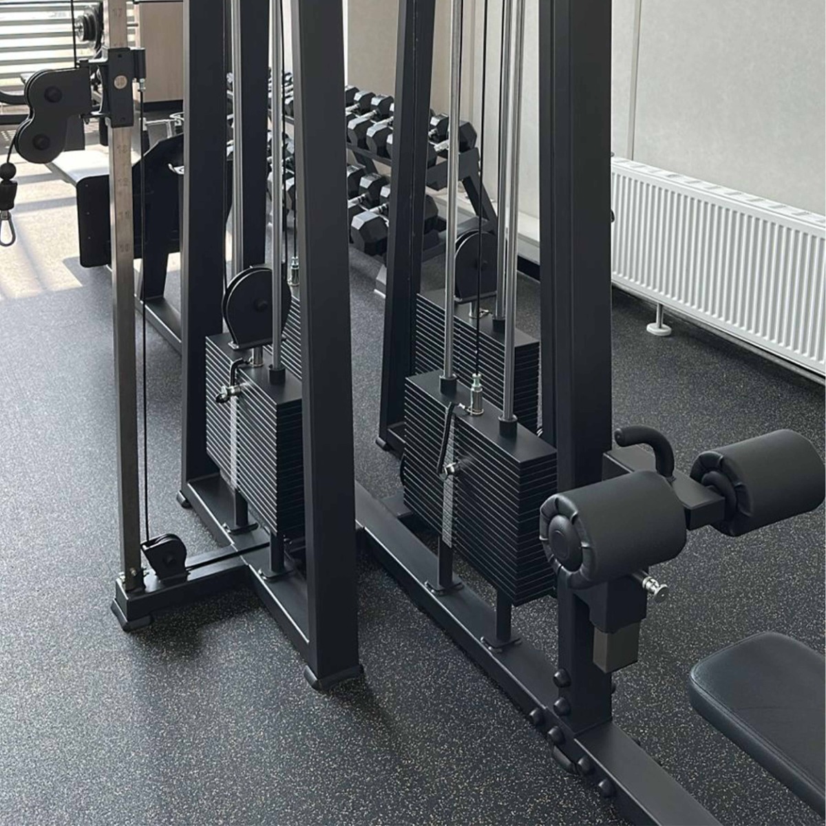 Тренажёр оснащён четырьмя независимыми весовыми стеками по 100 кг каждый.