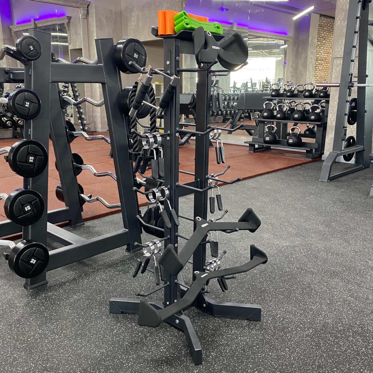 Вертикальная стойка для рукояток и аксессуаров имеет 6 рядов вертикальных держателей-крючков для инвентаря и горизонтальную полку, покрытую резиной, что позволяет ей удерживать большое количество предметов, располагая их на разных уровнях.