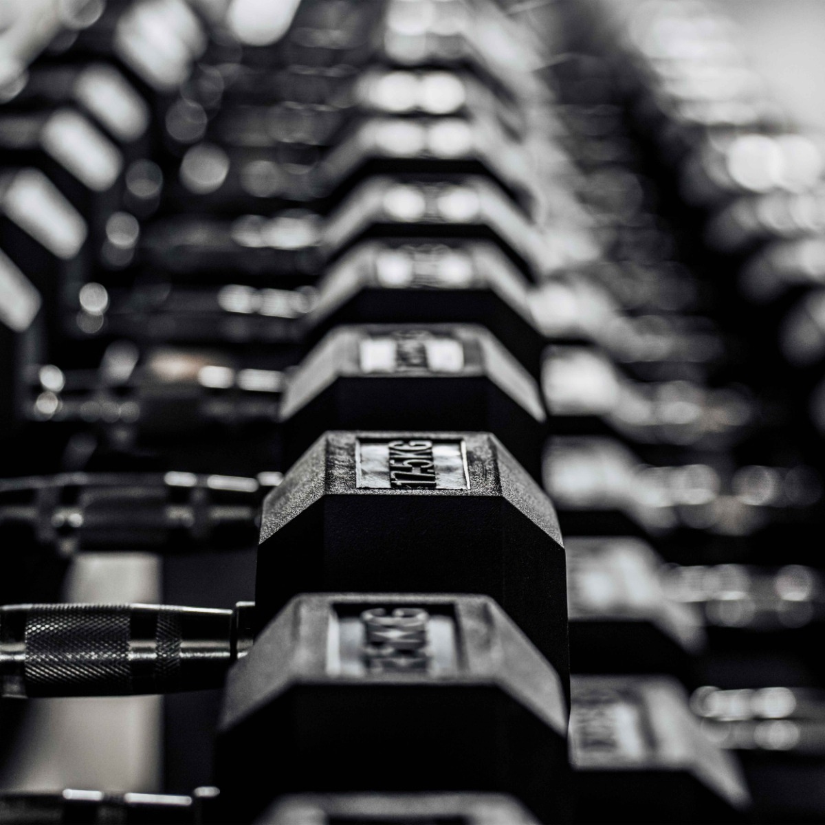 Шестиугольные грузы гантели, обеспечивающие устойчивое положение на любой поверхности, изготовлены из цельного металла.