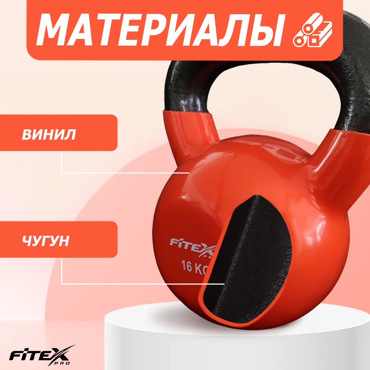 Гиря FITEX PRO сделана из чугуна и имеет плотное виниловое покрытие, которое не окрашивает стены и пол, снизит шум и убережет кожу рук от раздражения.