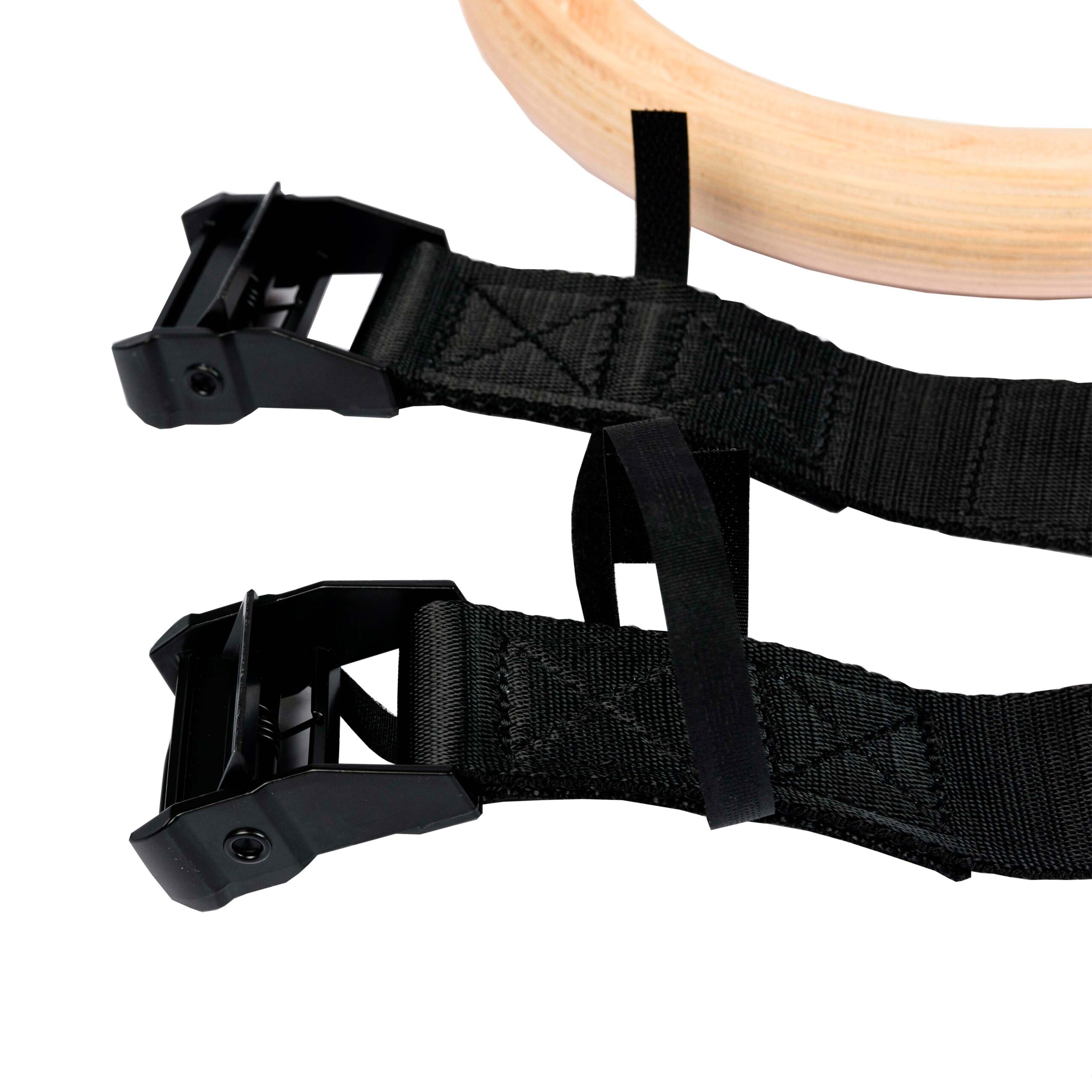 Гимнастические кольца представляют собой пару колец, изготовленных из многослойной фанеры, на которые установлены стропы. Поверхность колец тщательно отшлифована и имеет гладкую поверхность. В комплект входят пряжки пружинные для фиксации стропы.Благодаря удобному способу крепления — специальной системе подвеса, состоящей из прочнейшей стропы (каждая рассчитана на нагрузку в 1 тонну) и пружинного замка с расчетной нагрузкой в 250 кг, снаряд легко регулируется по высоте и просто фиксируется к любой горизонтальной перекладине (турник, детские качели, ветка дерева). Имеют специальный замок, расположенный на ремне для фиксации длины. Кольца хорошо зарекомендовали себя направлениях как Workout, Crossfit и в спортивной гимнастике. Упражнения на этом снаряде развивают мышцы рук, груди, плечевого корпуса и пресса. Тренируют чувство равновесия, выносливость, координацию.