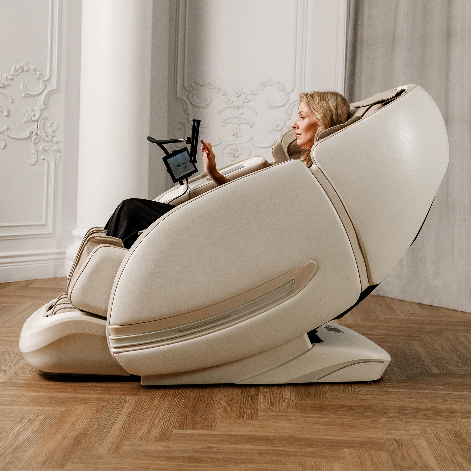 Функция Zero-G с двумя положениями невесомости оптимально распределяет вес тела и усиливает эффект массажа. Система Smart-Slide позволяет размещать кресло всего в 18 сантиметрах от стены. Встроенный биосенсор анализирует показатели организма и корректирует параметры работы. Управление осуществляется через интуитивно понятный планшет и кнопки быстрого доступа. Для комфортного использования смартфона во время сеанса предусмотрена специальная кнопка пролистывания ленты социальных сетей в области пальцев. В подлокотник встроена беспроводная зарядка для смартфона и подвижная подставка для гаджетов. Встроенные Bluetooth-колонки позволяют наслаждаться любимой музыкой во время сеанса массажа.