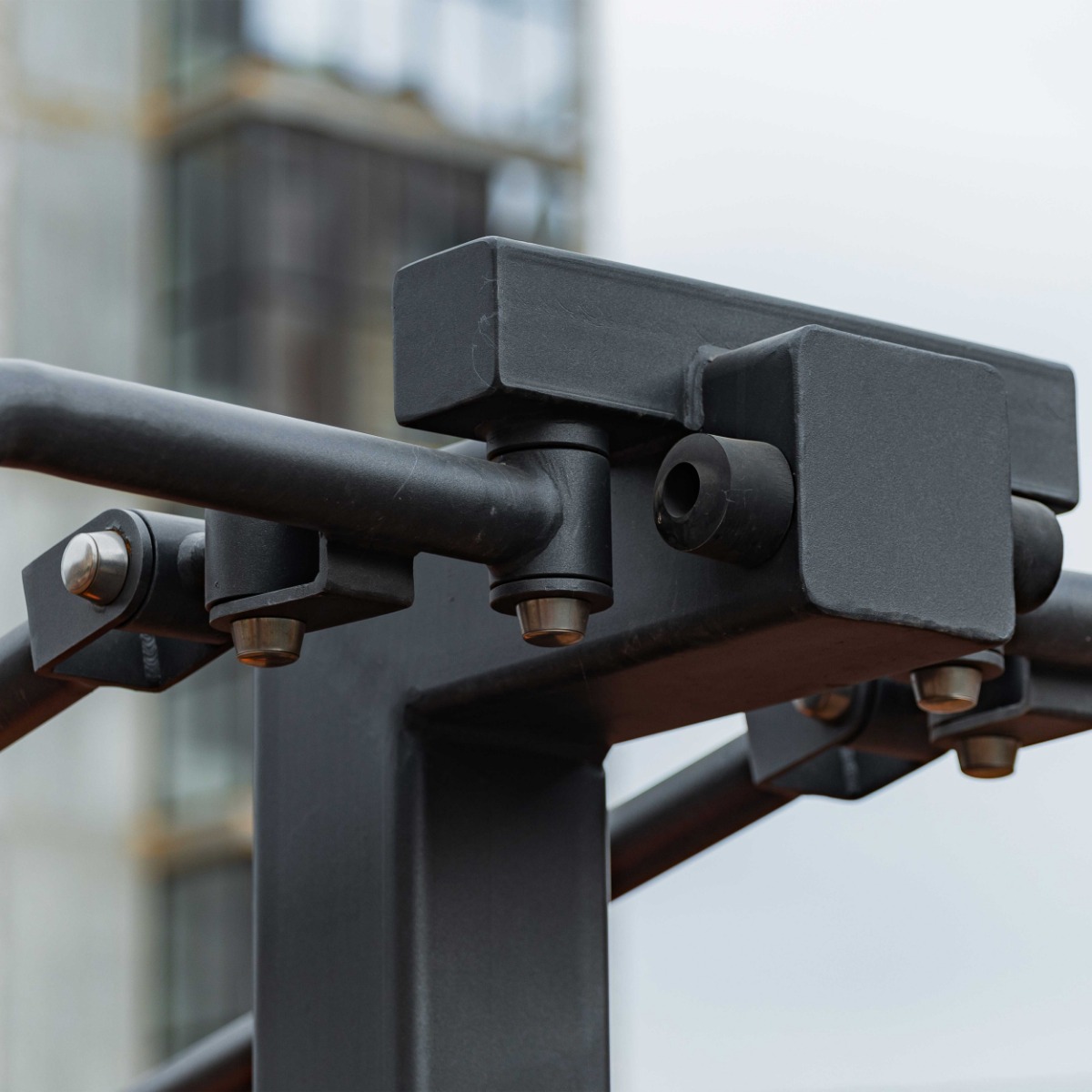 Несущая конструкция уличного тренажера выполнена из профильных труб 140×140 с толщиной стенки 5 мм. Детали изготовлены из листового металла толщиной 8 мм и 3 мм.