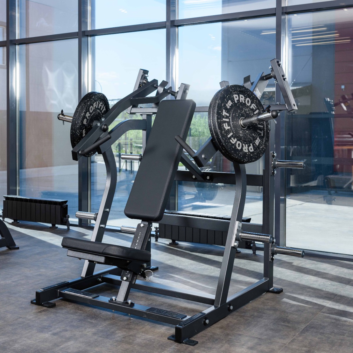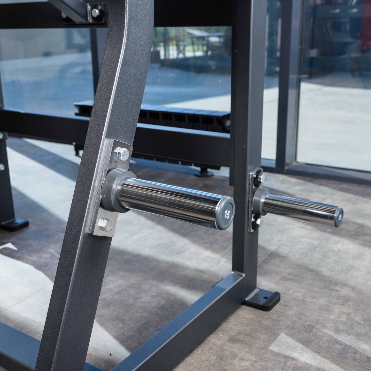 Количество хромированных накопителей для хранения свободных весов: шесть накопителей длиной 170 мм из толстостенной стальной трубы диаметром 48 мм. Максимальный вес на накопитель: 100 кг.