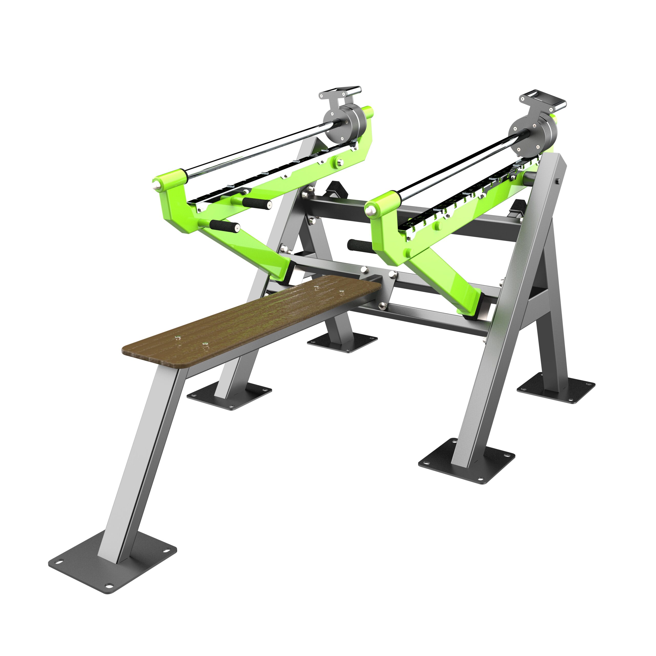 Фланцевое соединение опорного столба с закладной производится через четыре овальных отверстия размером 22×30 мм, расположенных на расстоянии 240 мм. Овальные отверстия под болтовое крепление М16 позволяют дополнительно регулировать положение тренажера. Резьбовые соединения защищены составными металлическими колпачками, входящими в комплект поставки.