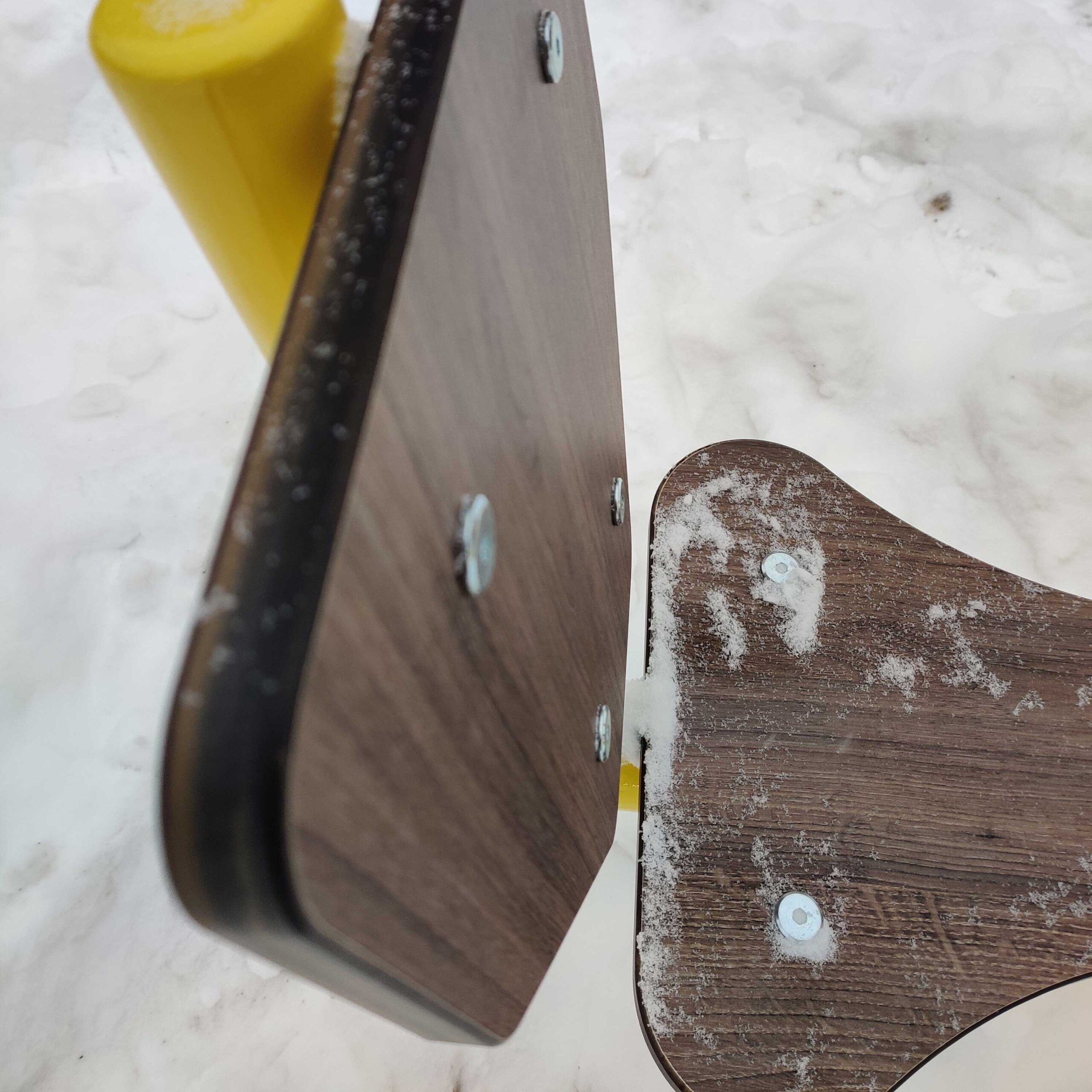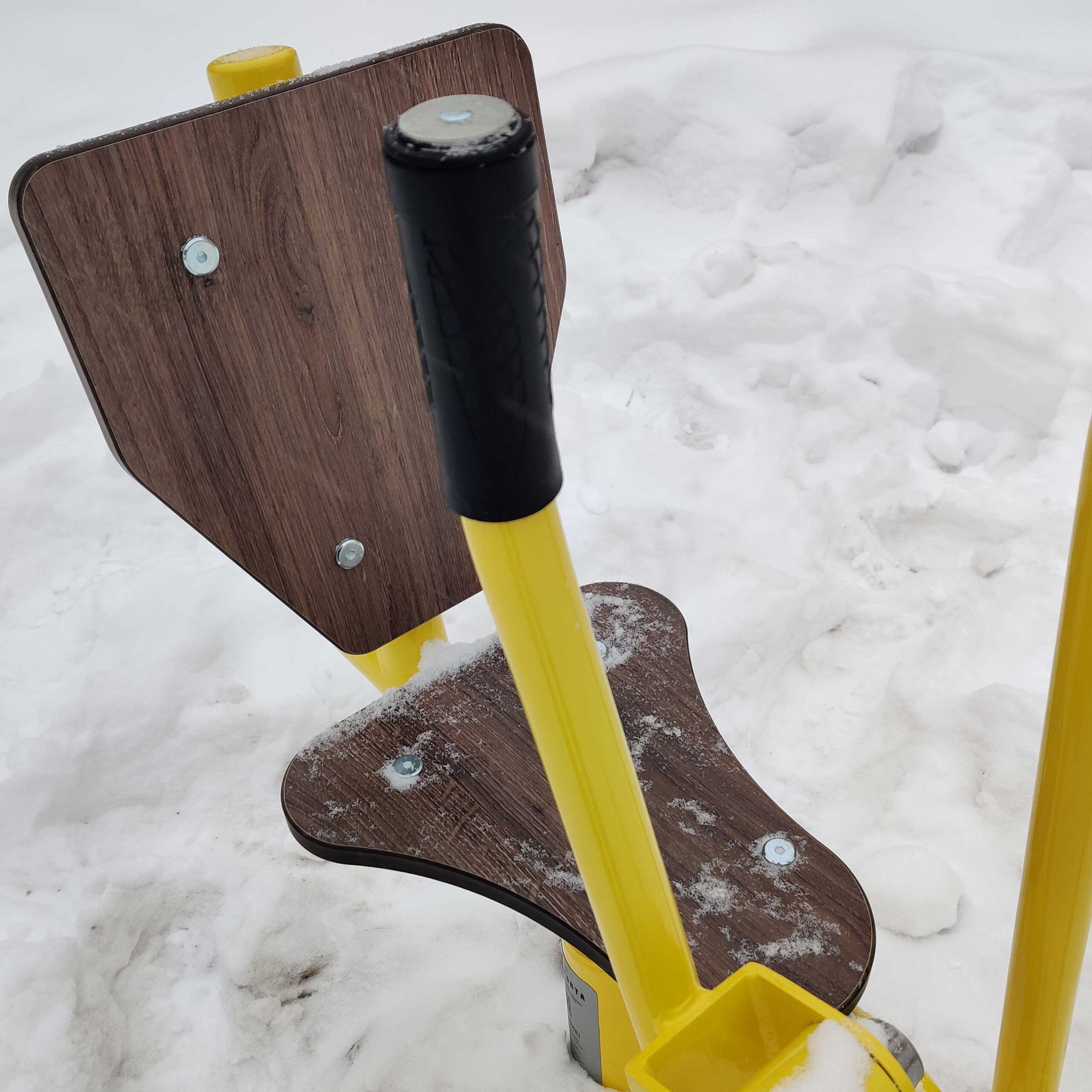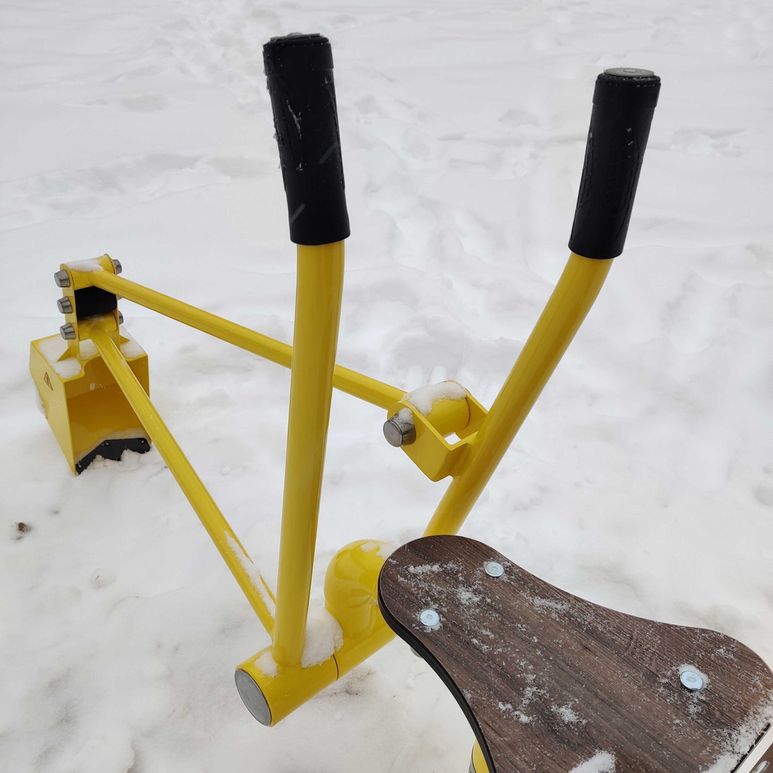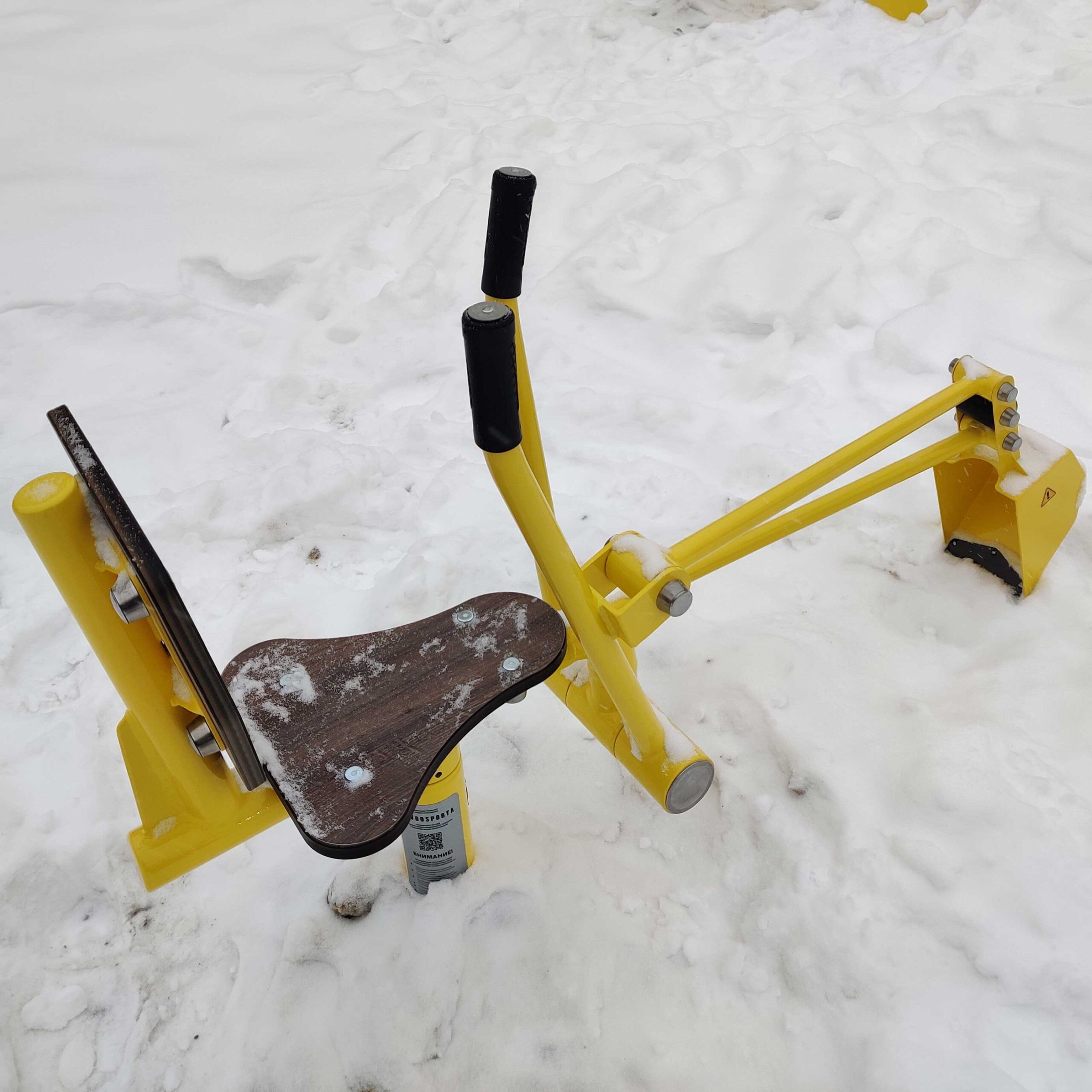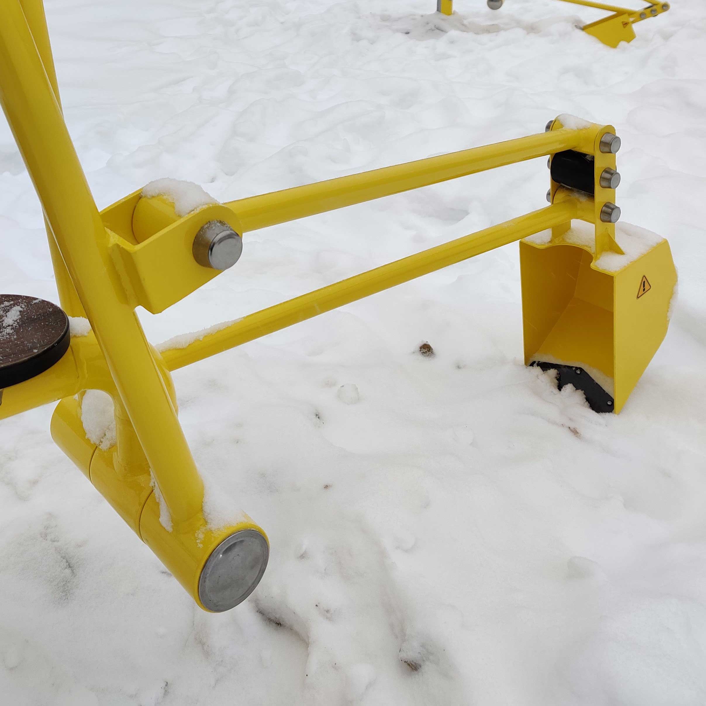 Оборудование состоит из опорного столба, сиденья со спинкой, рычага с рукоятями для управления ковшом и закладной. Закладная монтируется в грунт и заливается бетоном. Опорный столб крепится к закладной за счет фланцевого соединения и отсыпается песчано-гравийной смесью до уровня площадки. Фланцевое крепление позволяет надёжно смонтировать оборудование и беспрепятственно демонтировать при необходимости обслуживания. Монтажные схемы прилагаются к комплекту поставки.