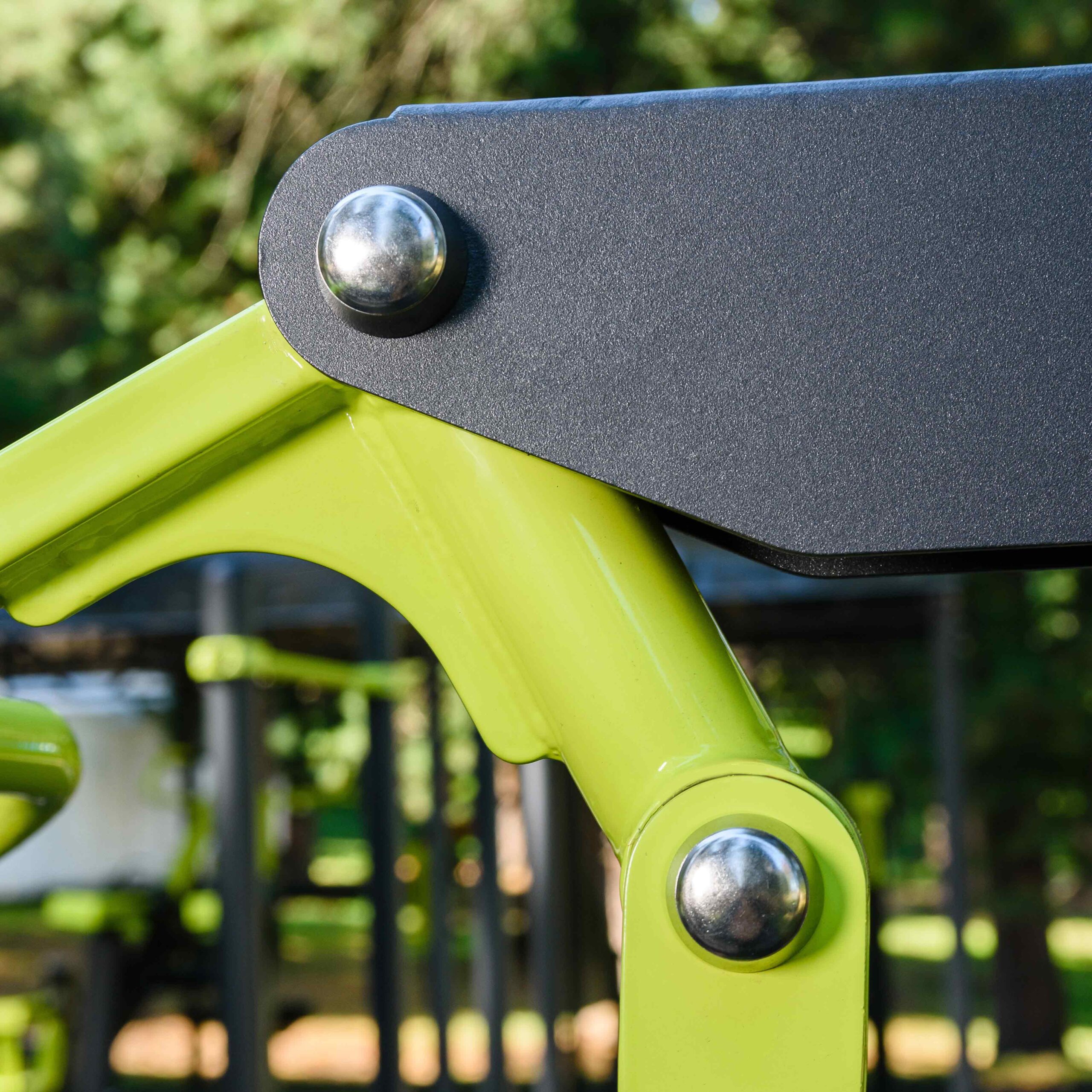 Фланцевое соединение опорного столба с закладной производится через четыре овальных отверстия размером 22×30 мм, расположенных на расстоянии 240 мм. Овальные отверстия под болтовое крепление М16 позволяют дополнительно регулировать положение тренажера. Резьбовые соединения защищены составными металлическими колпачками, входящими в комплект поставки.