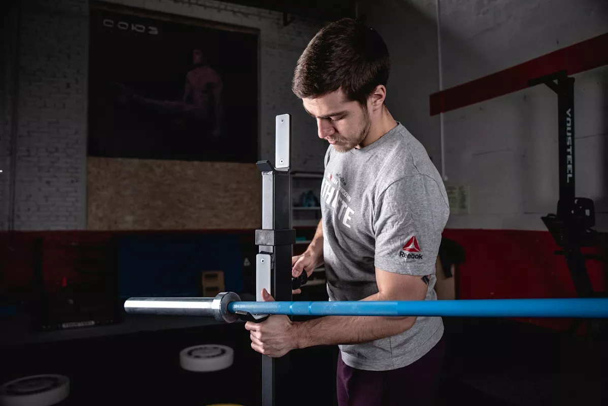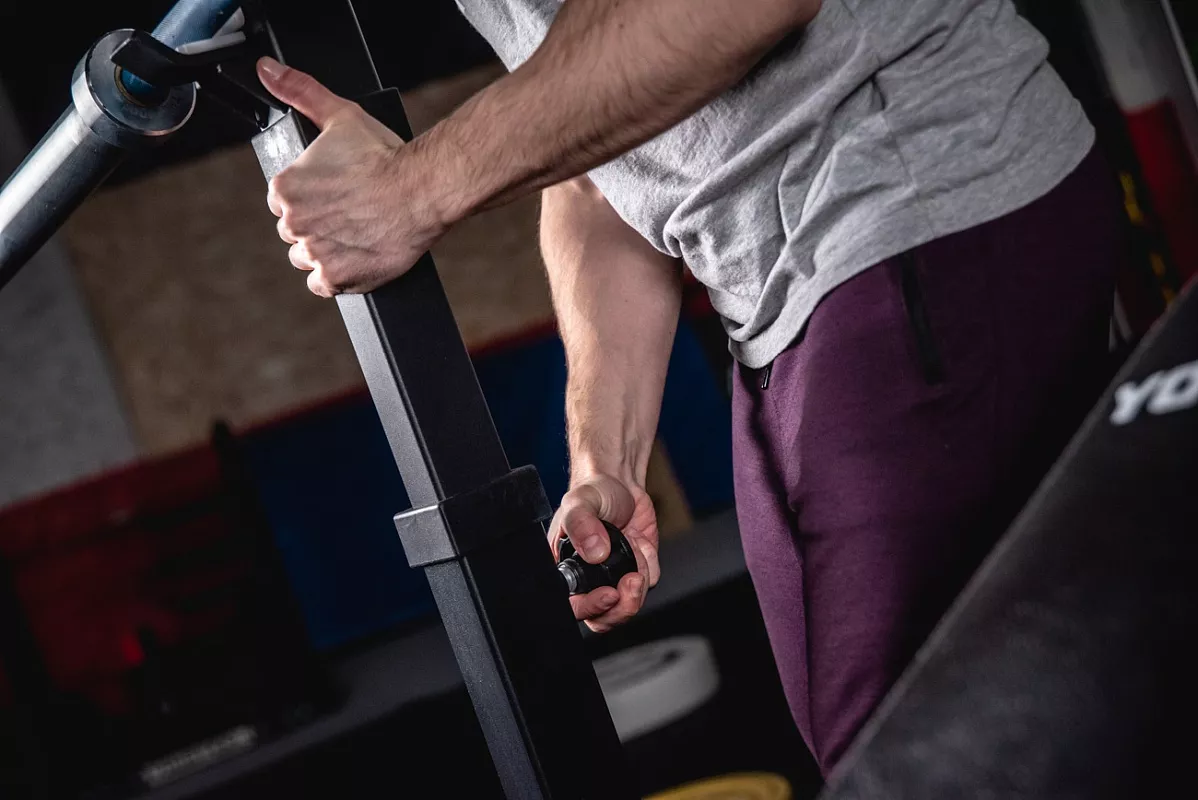 В этой версии стоек мы доработали конструкцию опоры, фиксирующие болты и изменили конструкцию нижней пары крюков, которые теперь по форме повторяют верхние. Благодаря этому выполнять жим лёжа стало гораздо удобней. Стойки стали жестче и устойчивее за счет того, что мы убрали механизм регулировки ширины. Теперь внутренняя ширина фиксированная – 1100мм. Механизм фиксации – болт с пружинным фиксатором. Во время тренировок с большими весами его можно закрутить, тем самым увеличив жёсткость фиксации. Но для ежедневных тренировок рядовых клиентов это не обязательно. На стойках 4 таких болта: 2 на регулировку высоты стоек и 2 на страховочные упоры. Верхние и нижние крюки покрыты пластиком, для предотвращения повреждения насечки грифа.