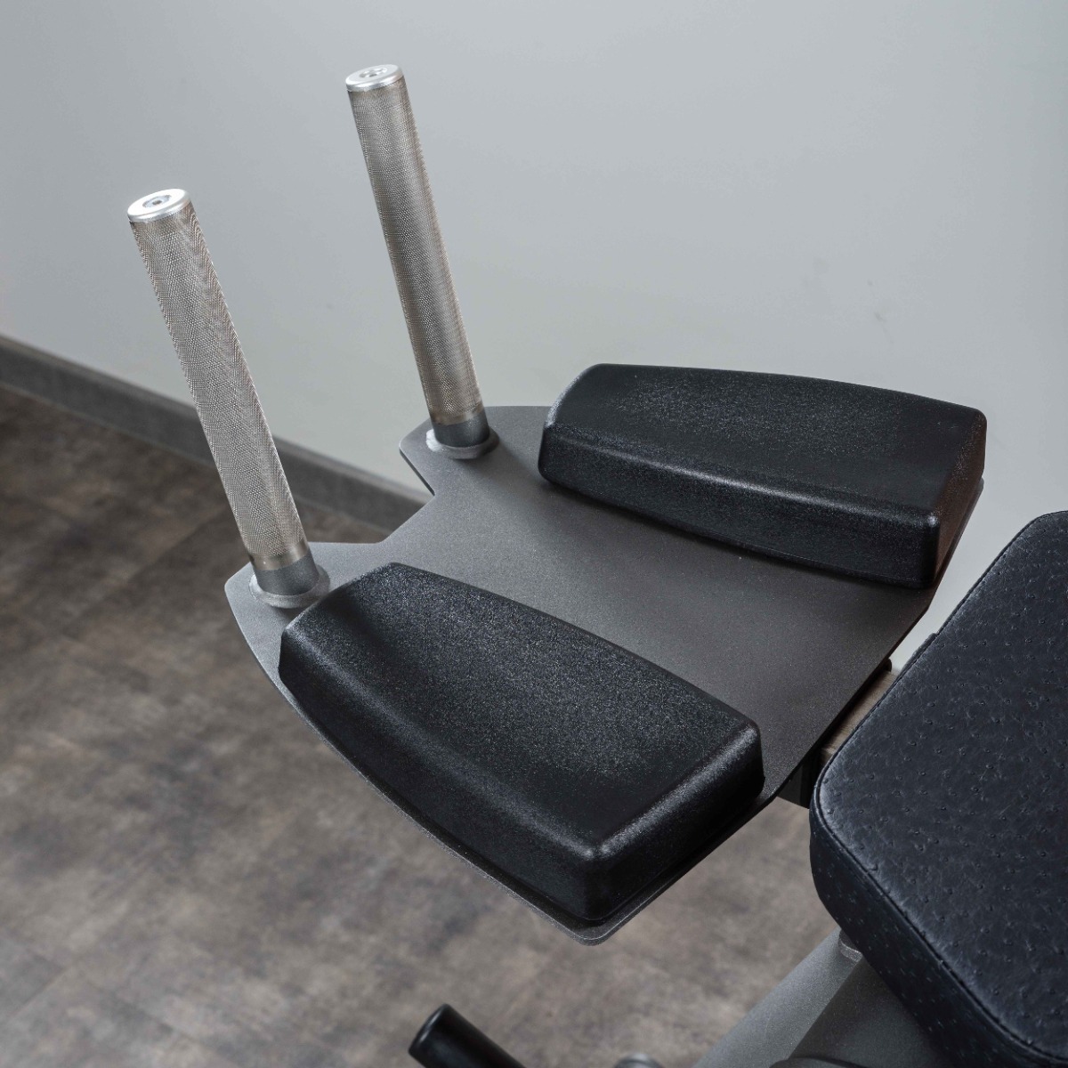 На рычаге установлен противовес, компенсирующий массу узла и создающий сбалансированное стартовое положение. Это повышает контроль движения, снижает начальную инерцию и обеспечивает плавный ход рычага при выполнении упражнения.