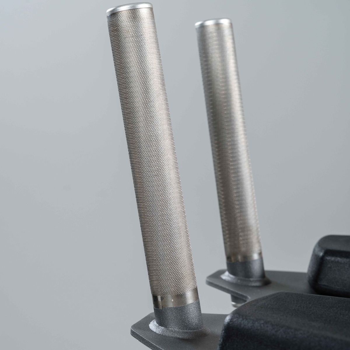 Рукояти длиной 220 мм, диаметром 35 мм, выполнены из хромированной стали с равномерной ромбовидной накаткой. Торцы оснащены металлическими заглушками, зафиксированными болтами.