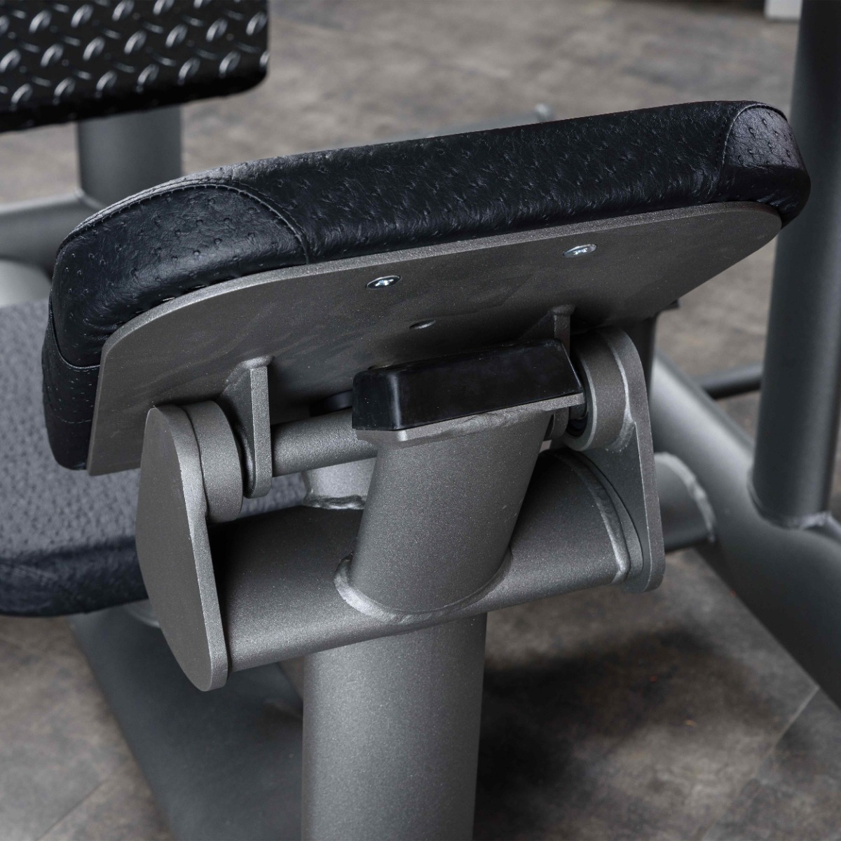 Спинка установлена на подшипниковом узле, обеспечивающем небольшое амплитудное движение при выполнении упражнения, и снабжена задним демпфером, предотвращающим контакт металлических элементов при отклонении. Спинка нерегулируемая.