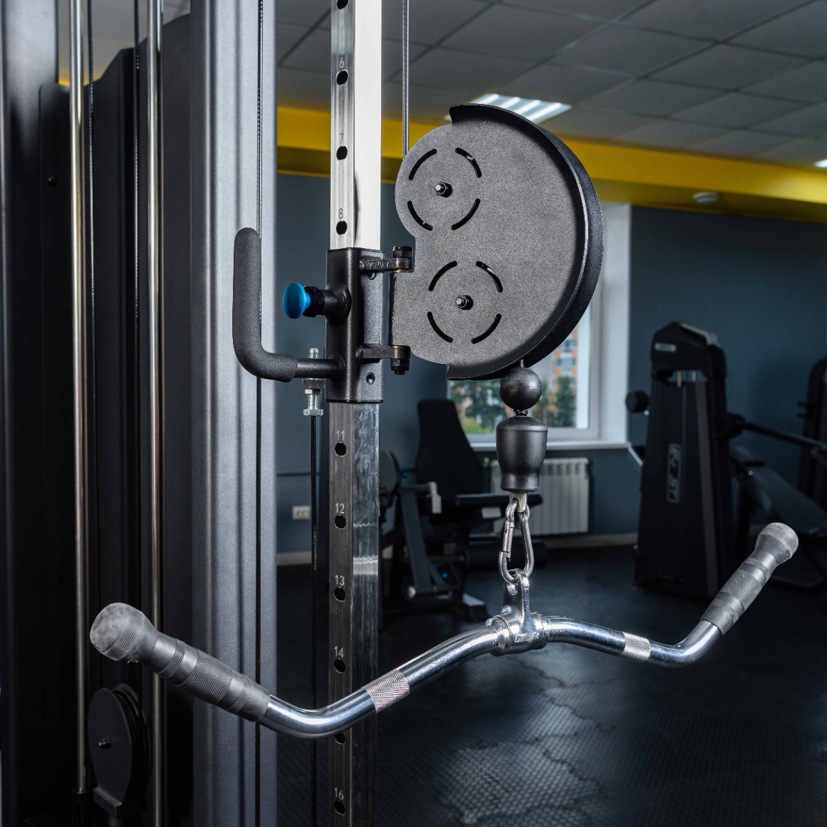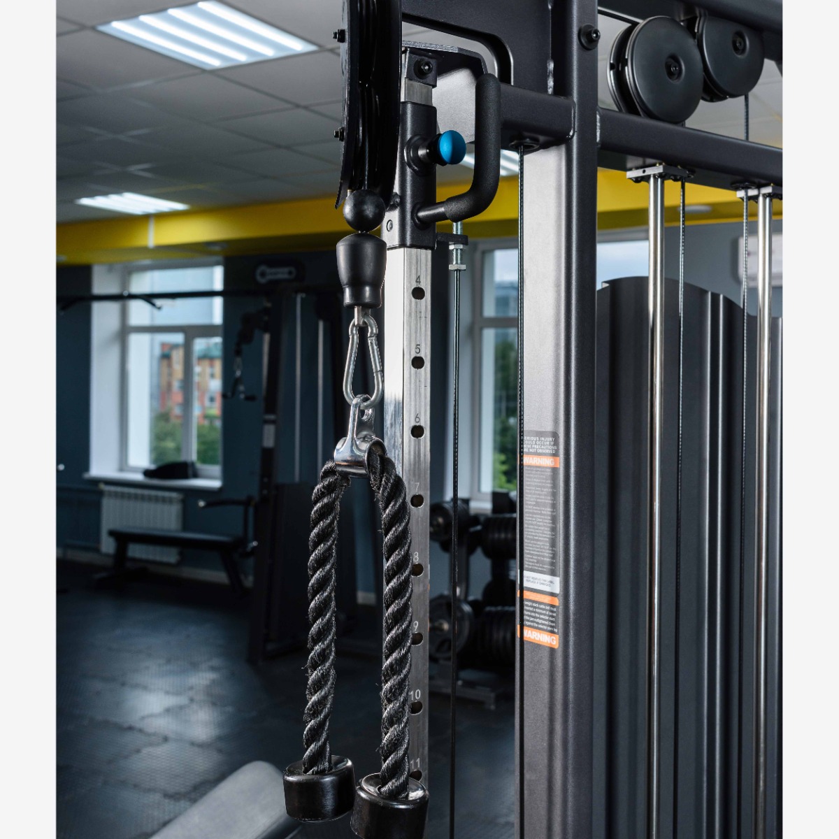 Силовой тренажер «E-1017В Комплекс для функциональных тренировок», соответствующий всем требованиям профессионального оборудования. Конструктивные элементы рамы изготовлены из высококачественной стали, покрыты износостойкой двухслойной полимерной краской. Толщина профиля 3 мм имеет большой радиус угла, что придает тренажеру более элегантный внешний вид. Резиновые подпятники обеспечивают устойчивость и предотвращают повреждение полового покрытия в помещении. Для приведения грузоблока в движение используется трос диаметром 5,8 мм.