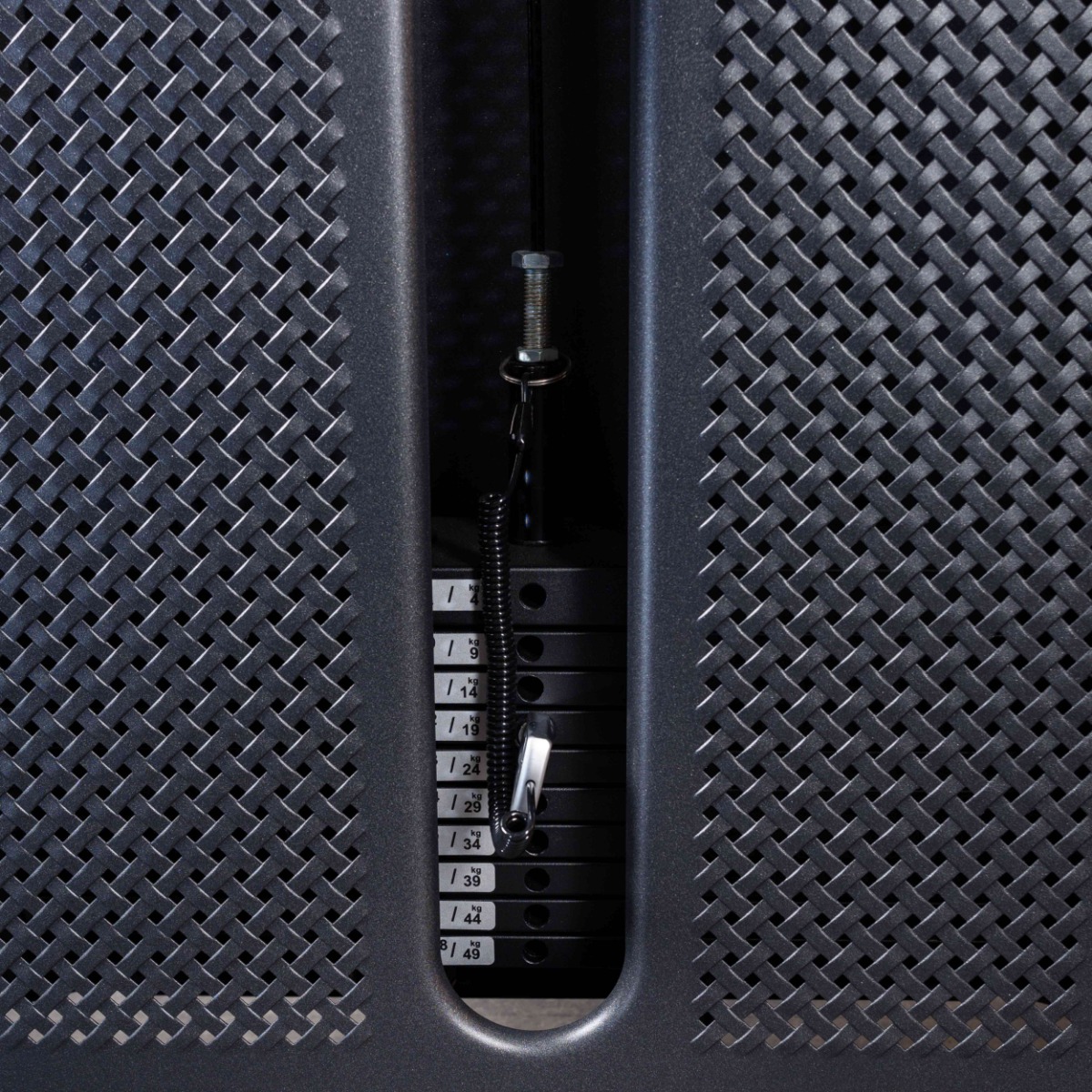 Металлическая перфорированная защита весового стека с лицевой стороны и сплошная защита с задней стороны выполнена из листового металла толщиной 2 мм. Ребра жесткости у основания, примыкающие к несущей раме через скрытое болтовое соединение сечением 6 мм в восьми точках, повышают эксплуатационные параметры тренажера.