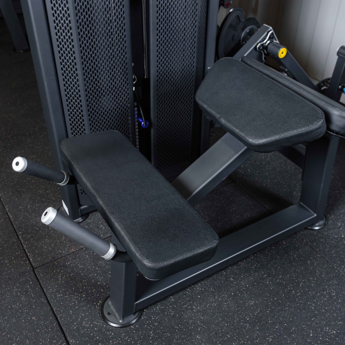 Нескользящие прочные рукоятки с резиновым покрытием и декоративными заглушками – наконечниками из полированного нержавеющего металла зафиксированные болтом, расположены под оптимальным углом для надежной фиксации тела атлета во время тренировки.