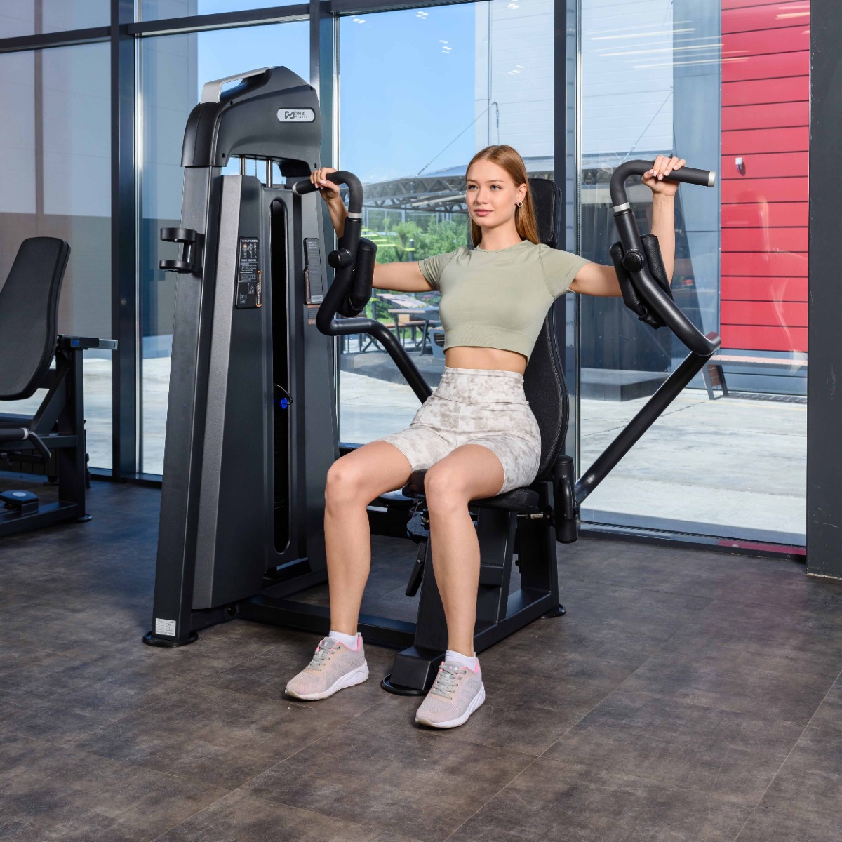 Тренажёр предназначен для тренировки большой и малой грудной мышцы, дополнительную нагрузку получает трицепс плеча.