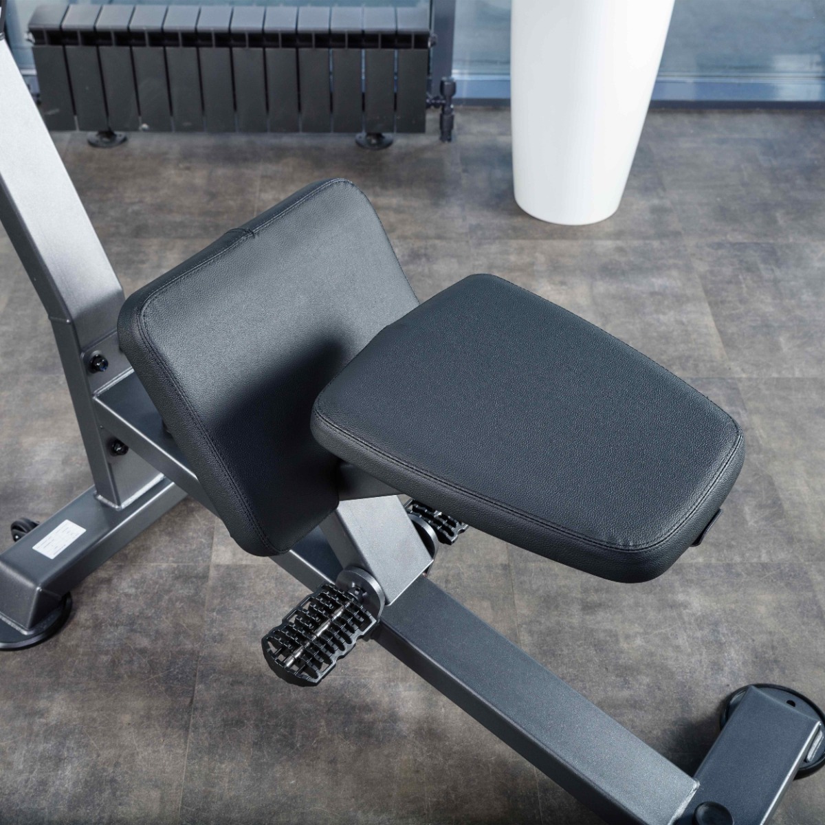 Сиденье и опорная полушка закреплены на металлическом основании, перемещающемся по дугообразной траектории для вариативности использования тренажера.