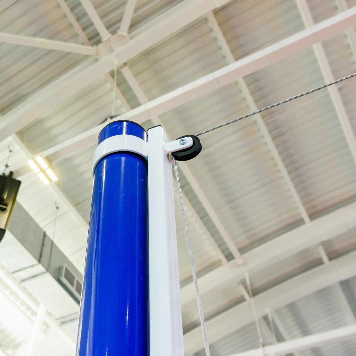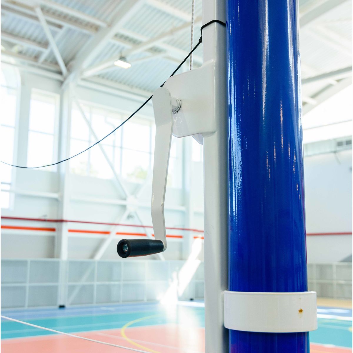 Стойка правая для волейбола представляет собой разборную конструкцию, состоящую из мачты, скользящего натяжного механизма и стакана.